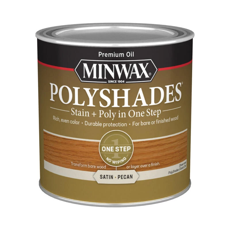 Minwax Polyshades combines stain and polyurethane in one simple step. Each coat provides rich color and lasting protection while enhancing the wood grain. This product will reduce finishing time compared with staining with one product and protecting with another. Polyshades stain and polyurethane also allows you to easily change the color of your currently stained or varnished wood without stripping. Over old varnish you can change the color without removing the old finish or hiding the grain.