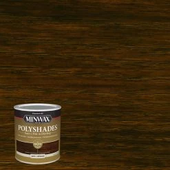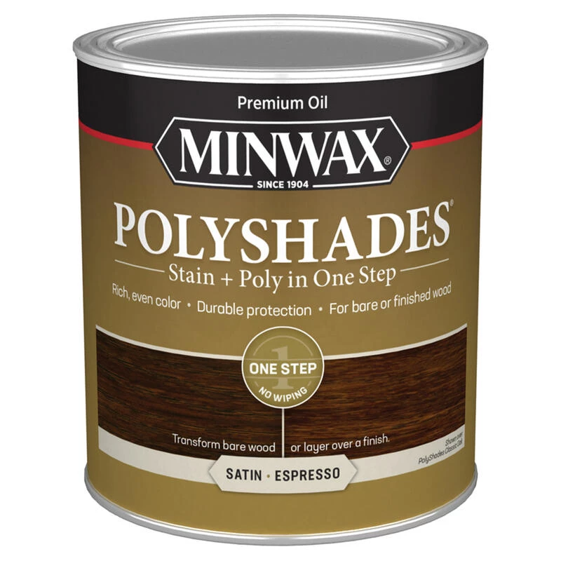 Minwax PolyShades combines stain and polyurethane in one simple step. Each coat provides rich color and lasting protection while enhancing the wood grain. This product will reduce finishing time compared with staining with one product and protecting with another. PolyShades stain and polyurethane also allows you to easily change the color of your currently stained or varnished wood without stripping. Over old varnish you can change the color without removing the old finish or hiding the grain. For additional protection, without adding color, add a coat of Minwax fast-drying polyurethane or Minwax wipe-on poly. Using a natural bristle brush, dip approximately an inch into the can, gently tapping it against the inside to remove any excess. Apply a very thin, even coat following the direction of the grain. Make sure to maintain a “Wet” edge. To minimize the brush marks and bubbles after staining, tip off the surface by holding the brush at a 45 degree angle and lightly run the bristles over the entire length of the wood. Let the first coat dry for 6 hours or more. Dry time may be extended due to high humidity, low temperature and inadequate ventilation or if the coat is applied too thick. Rub the surface lightly with fine steel wool. Remove all dust. Brush on a second thin coat following directions above. To deepen the color, apply a third coat. To help ensure uniform acceptance of stain color and beautiful results, pretreat new or raw wood with oil-based Minwax pre-stain wood conditioner, following label directions.
