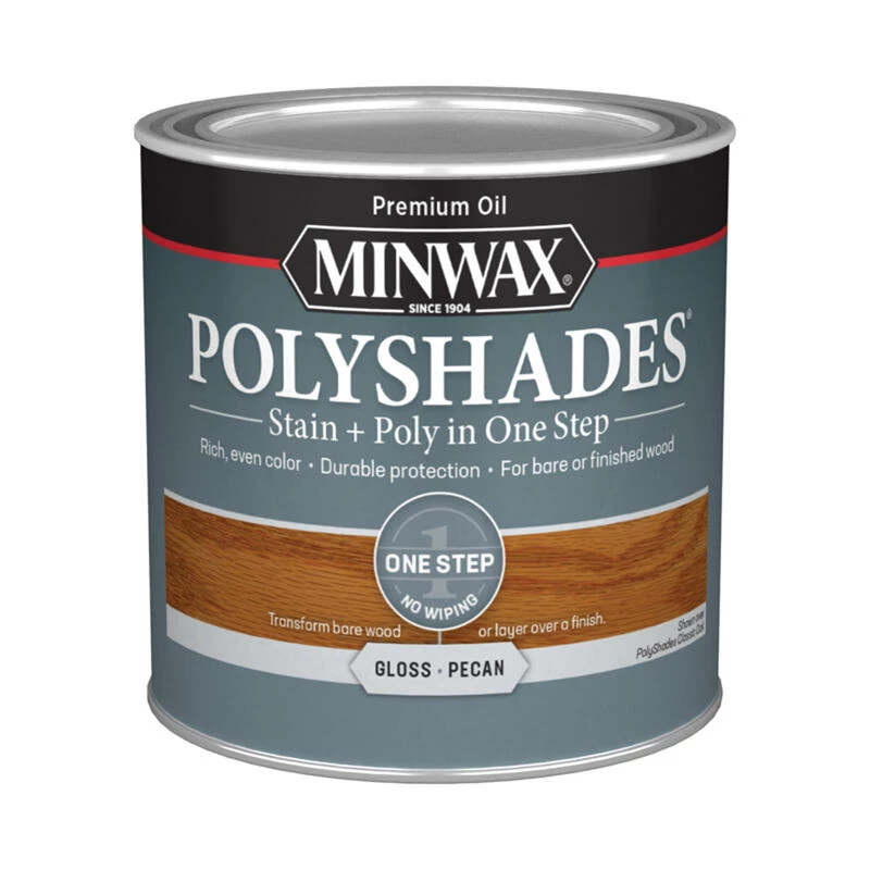 Minwax Polyshades combines stain and polyurethane in one simple step. Each coat provides rich color and lasting protection while enhancing the wood grain. This product will reduce finishing time compared with staining with one product and protecting with another. Polyshades stain and polyurethane also allows you to easily change the color of your currently stained or varnished wood without stripping. Over old varnish you can change the color without removing the old finish or hiding the grain.
