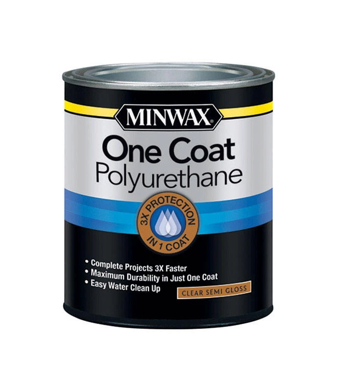 Protect your wood projects and get more done, faster, with Minwax One Coat polyurethane protective finish. This crystal clear protective top coat dries in just two hours and lets you complete wood projects 3x faster without sacrificing durability. The advanced formulation in this clear top coat provides the same level of durability in one coat the is comparable to three coats of a conventional polyurethane. Use it to easily protect and add beauty to your wood projects. It’s non-ambering and also cleans up easily with just soap and warm water. It is available in a variety of sheens. Apply a coat of Minwax One Coat polyurethane with a high-quality synthetic bristle brush. Apply in the direction of the wood grain in one smooth, uniform coat. Special Instructions: Minwax One Coat polyurethane should not be applied over red mahogany stains. Instead use Minwax fast drying polyurethane or Minwax water based oil-modified polyurethane over any red mahogany stain. Special instructions: Minwax One Coat polyurethane is not recommended for use on floors because it would require more frequent recoating in high traffic areas. Instead, we recommend Minwax super fast drying polyurethane for floors or Minwax ultimate floor finish for maximum durability. Surface must be dry and free of wax, grease, polish, old finishes in poor condition or any foreign matter. Sand to a smooth, uniform surface. Do not use steel wool. Remove dust with a damp cloth. Let dry completely. Advanced formulation provides the same level of durability in one coat that is comparable to three coats of a conventional polyurethane.
