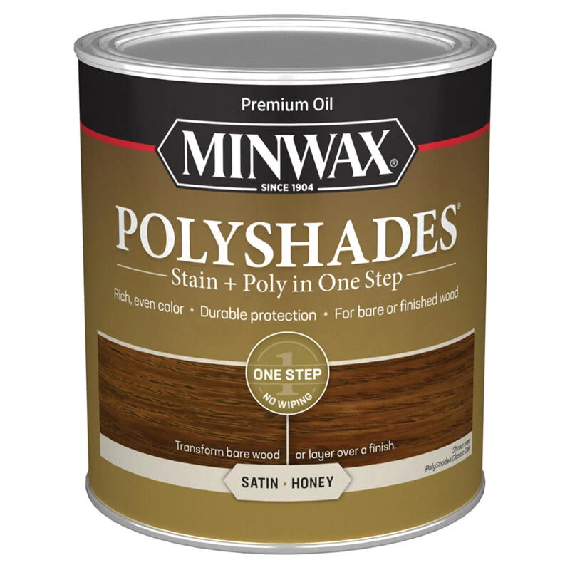 Minwax PolyShades combines stain and polyurethane in one simple step. Each coat provides rich color and lasting protection while enhancing the wood grain. This product will reduce finishing time compared with staining with one product and protecting with another. PolyShades stain and polyurethane also allows you to easily change the color of your currently stained or varnished wood without stripping. Over old varnish you can change the color without removing the old finish or hiding the grain. For additional protection, without adding color, add a coat of Minwax fast-drying polyurethane or Minwax wipe-on poly. Using a natural bristle brush, dip approximately an inch into the can, gently tapping it against the inside to remove any excess. Apply a very thin, even coat following the direction of the grain. Make sure to maintain a “Wet” edge. To minimize the brush marks and bubbles after staining, tip off the surface by holding the brush at a 45 degree angle and lightly run the bristles over the entire length of the wood. Let the first coat dry for 6 hours or more. Dry time may be extended due to high humidity, low temperature and inadequate ventilation or if the coat is applied too thick. Rub the surface lightly with fine steel wool. Remove all dust. Brush on a second thin coat following directions above. To deepen the color, apply a third coat. To help ensure uniform acceptance of stain color and beautiful results, pretreat new or raw wood with oil-based Minwax pre-stain wood conditioner, following label directions.